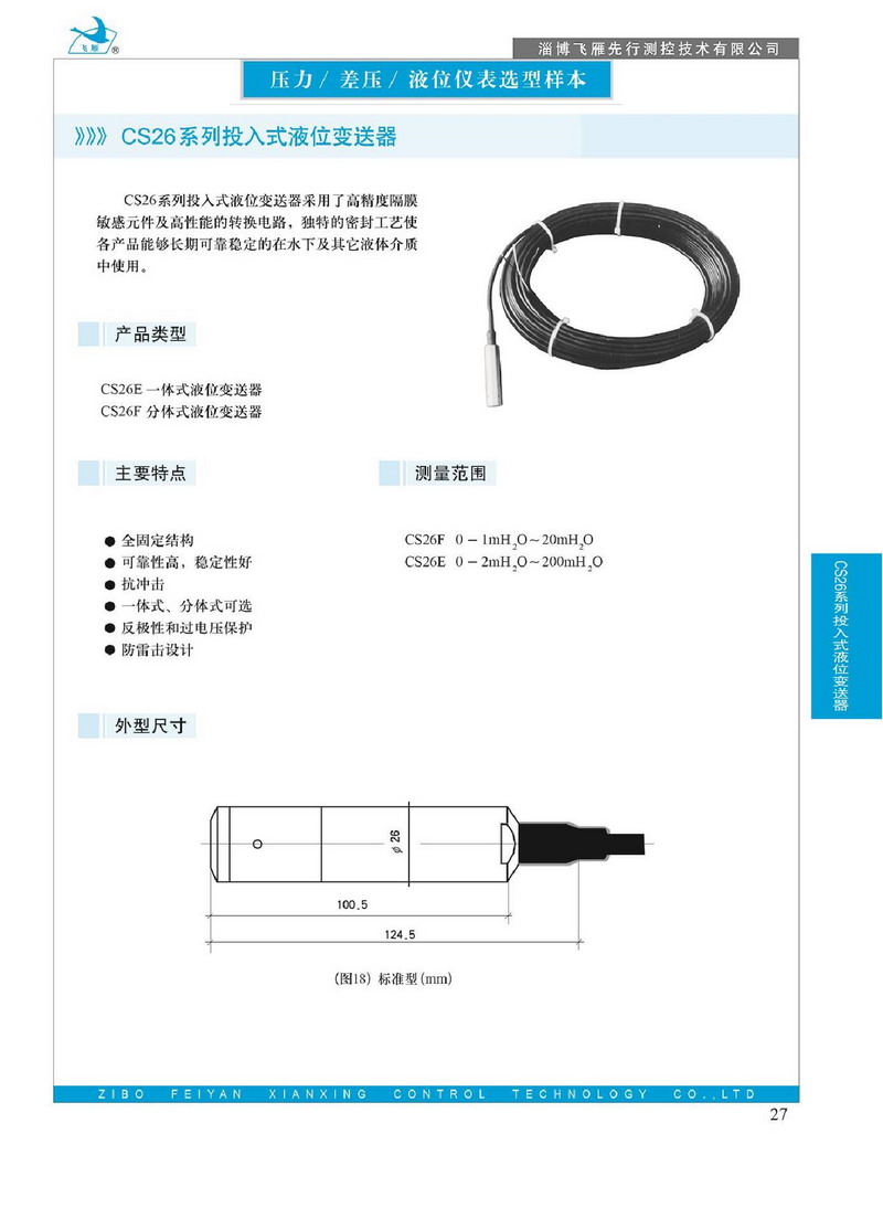CS26系列投入式液位變送器采用了高精度隔膜敏感元件及高性能的轉(zhuǎn)換電路,獨(dú)特的密封工藝使各產(chǎn)品能夠長(zhǎng)期可靠穩(wěn)定的在水下及其它液體介質(zhì)中使用。