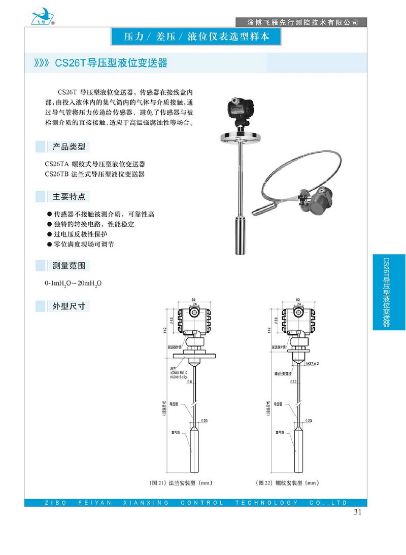 CS26T導(dǎo)壓型液位變送器,傳感器在接線盒內(nèi)部,由投入液體內(nèi)的集氣筒內(nèi)的氣體與介質(zhì)接觸,通過導(dǎo)氣管將壓力傳遞給傳感器,避免了傳感器與被檢測介質(zhì)的直接接觸,適應(yīng)于高溫強腐蝕性等場合。