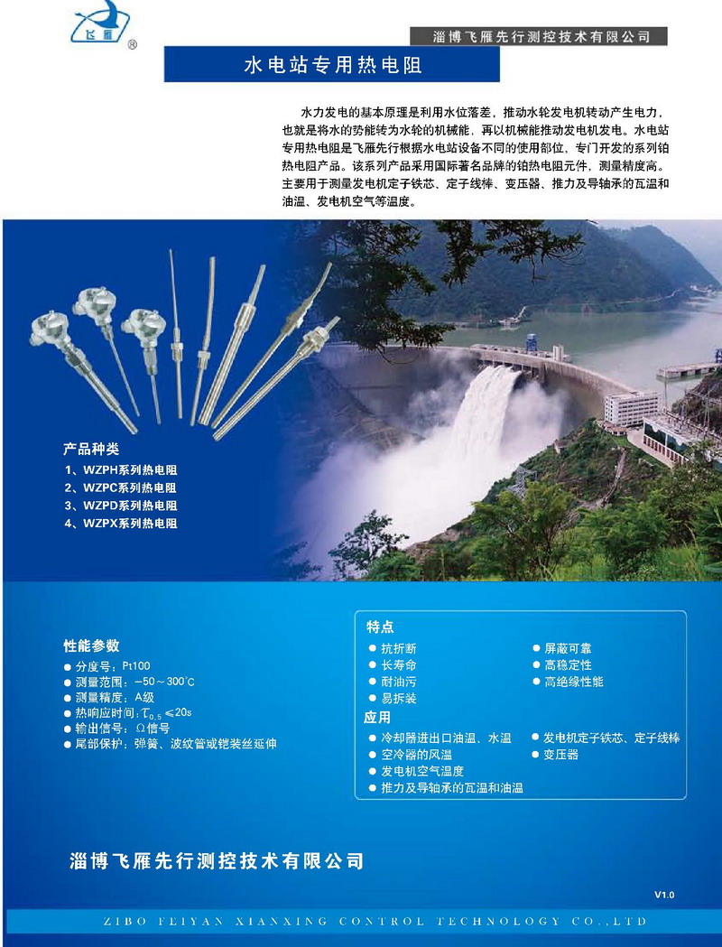 水力發(fā)電的基本原理是利用水位落差,推動水輪發(fā)電機轉(zhuǎn)動產(chǎn)生電力,也就是將水的勢能轉(zhuǎn)為水輪的機械能,再以機械能推動發(fā)電機發(fā)電。水電站專用熱電阻是飛雁先行根據(jù)水電站設備不同的使用部位,專門開發(fā)的系列鉑熱電阻產(chǎn)品。該系列產(chǎn)品采用國際著名品牌的鉑熱電阻元件,測量精度高。主要用于測量發(fā)電機定子鐵芯、定子線棒、變壓器、推力及導軸承的瓦溫和油溫、發(fā)電機空氣等溫度。